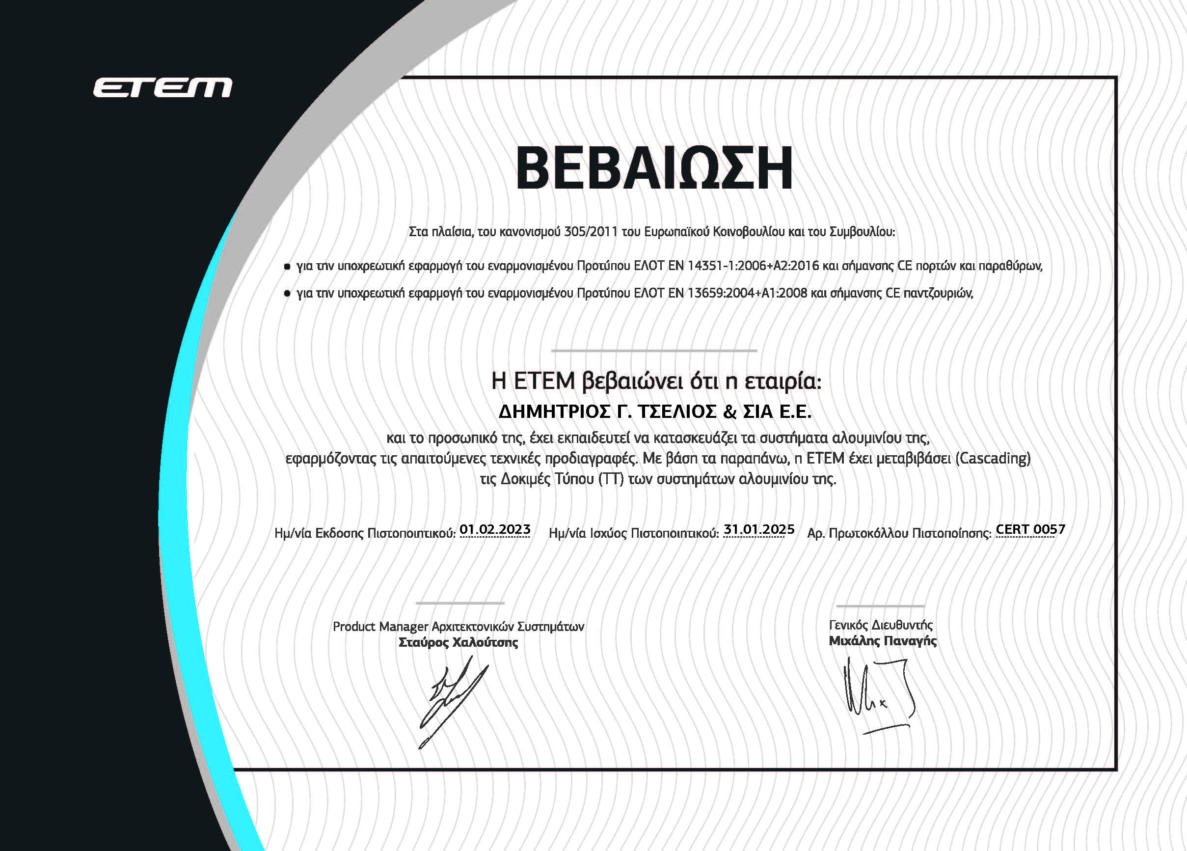 Η εταιρεία μας είναι πιστοποιημένη κατασκευάστρια κουφωμάτων αλουμινίου από την ΕΤΕΜ Α.Ε.
