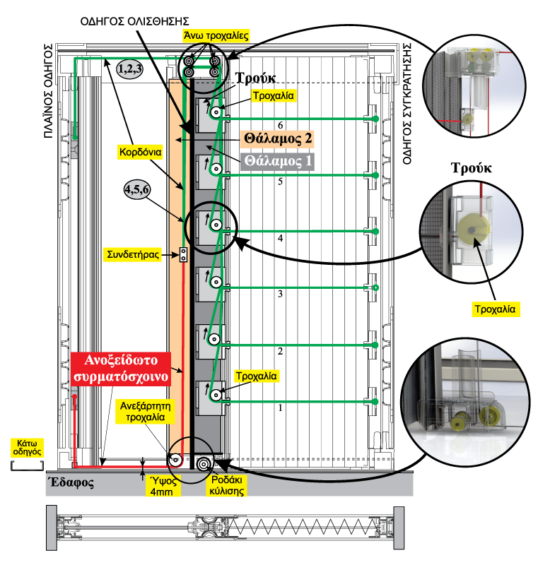 - τροχαλίες στα άνω και κάτω εξαρτήματα του οδηγού ολίσθησης