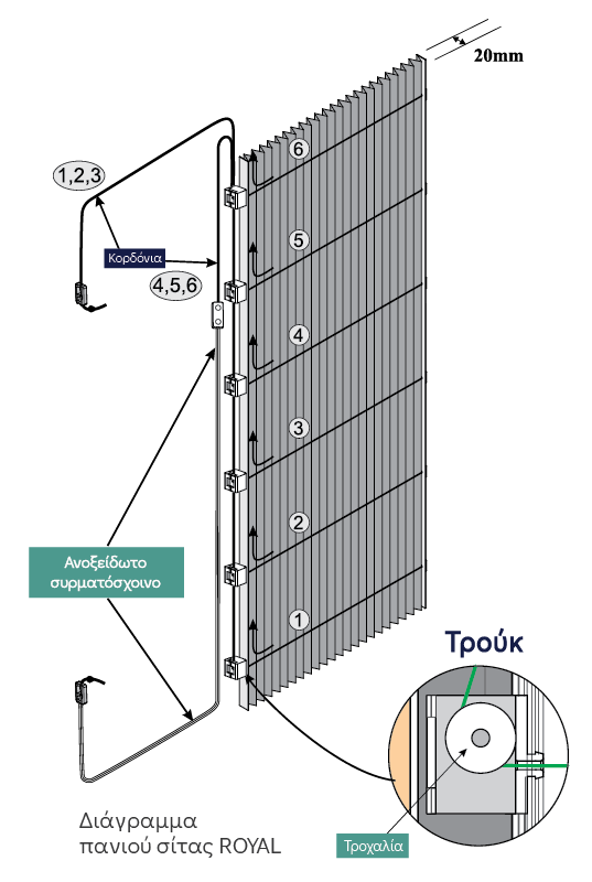 - Στο θάλαμο 1 κινούνται στις τροχαλίες των τρούκ τα οριζόντια κορδόνια “1,2,3,4,5,6 “ της σίτας κατευθυνόμενα όλα προς τα επάνω.
